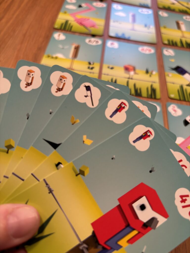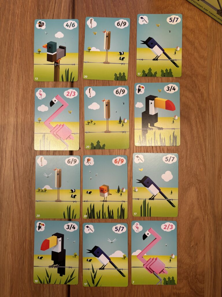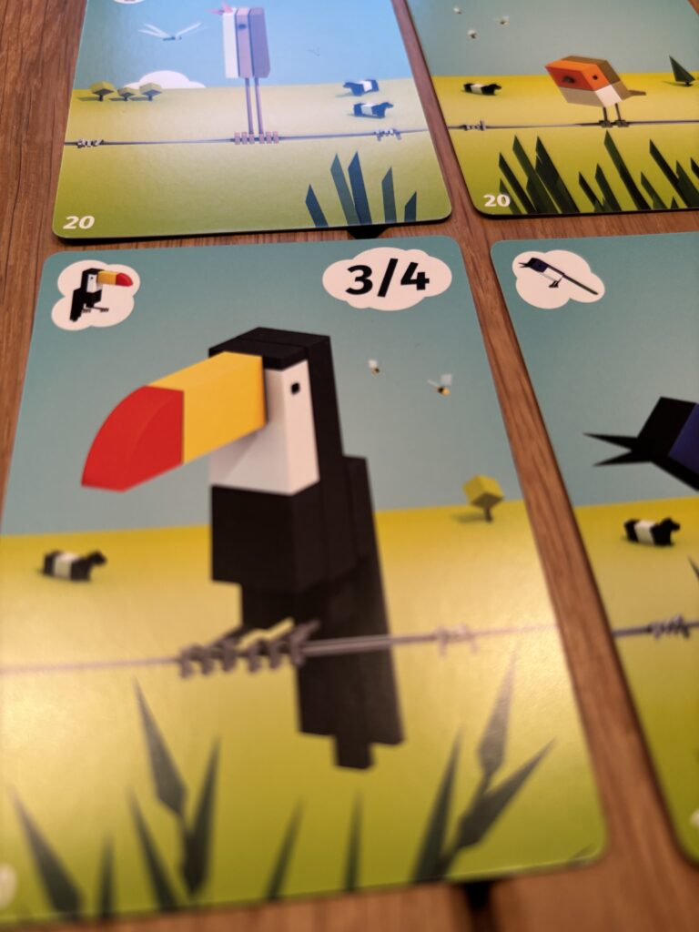 Bei den Karten hätte ich mir gewünscht, dass die Voraussetzungen für kleine und große Schwärme sowie das jeweilige Vogelsymbol in allen Ecken zu sehen sind, idealerweise rechts und links. So wären die Informationen unabhängig davon, wie man die Karten auf der Hand hält, jederzeit schnell erkennbar. Gerne auch in einer etwas kleineren Schachtel.