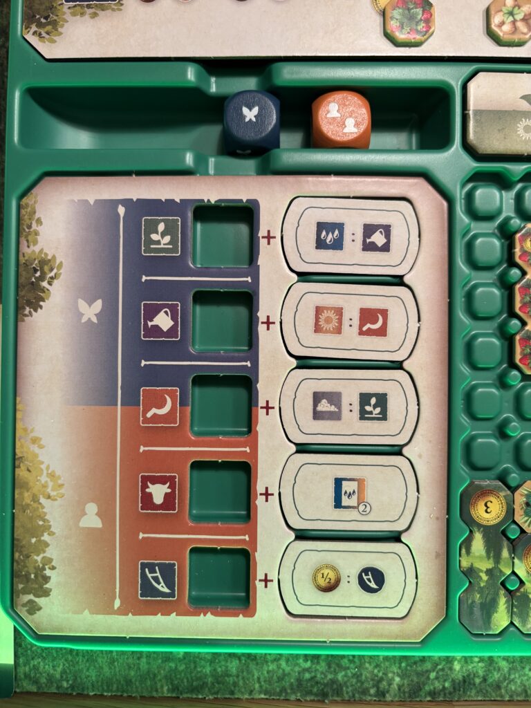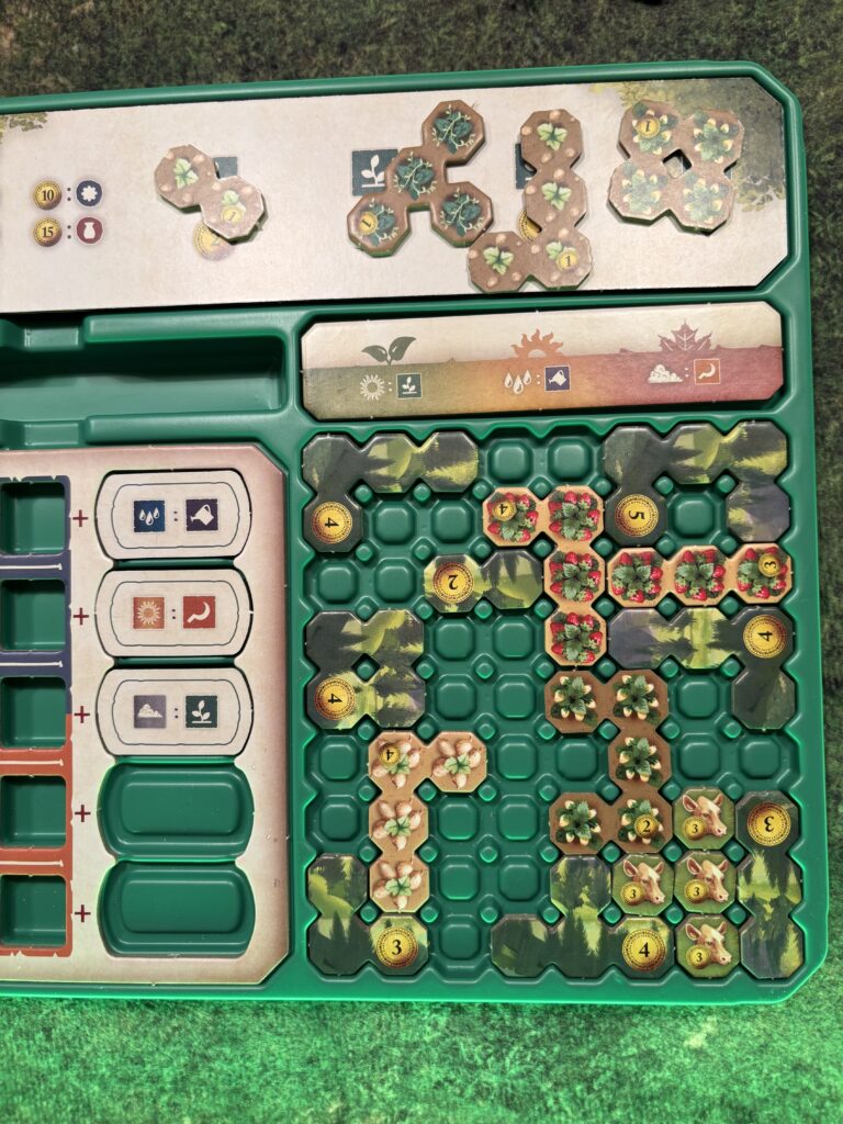 Zuerst lege ich das Wetterplättchen, das Tableau und das Charakterplättchen wie in der Anleitung abgebildet in meinen Sortierkasten. Danach nehme ich mir meine Figur, zehn Münzen und lege das restliche Material bereit. Die Pflanzenplättchen packe ich in den Beutel. Der Pflanzenmarkt wird zu Beginn mit vier Pflanzenplättchen aufgefüllt. Den Wildwuchs darf ich nicht vergessen. Hier in „Mythwind“ ist ja noch nichts angebaut, deshalb sind einige Anbauflächen von dichten Pflanzen überwuchert.