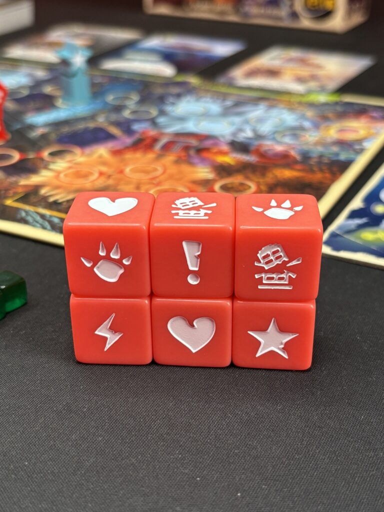 Das gelingt euch in dem ihr die Würfel bis zu drei Mal werfen dürft und euch passende Würfelergebnisse auswählt. Die Symbole zeigen Angriff, Energie, Heilung oder Fortschritt in Ruhm bzw. Zerstörung.