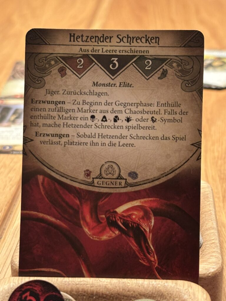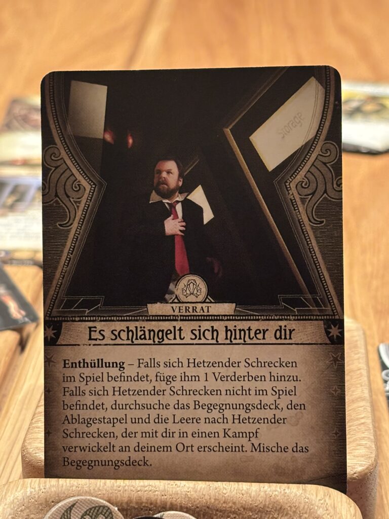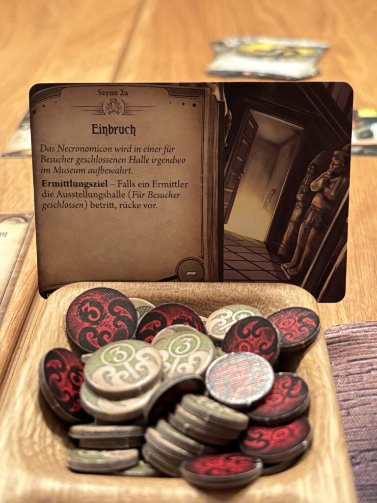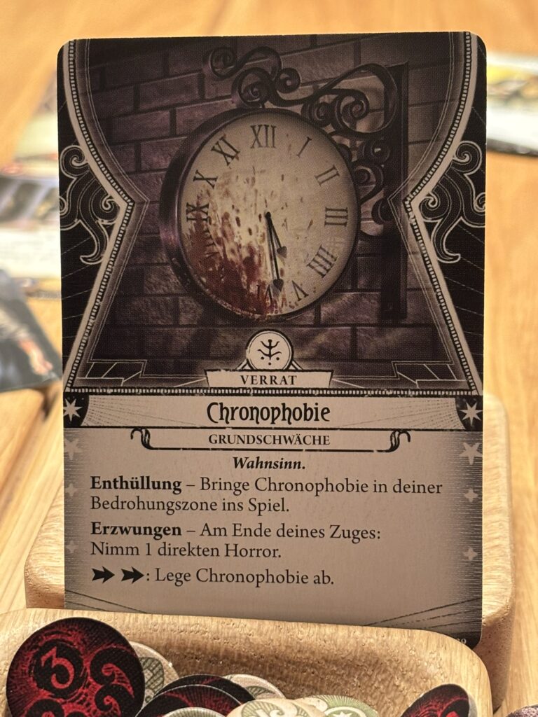 Zu allem Unglück hat der „Hetzende Schrecken“ Rex nicht vergessen und rennt ihm hinterher ins Sicherheitsbüro. Er schnappt ihn direkt und greift ihn an. Das alles geht so schnell, da ist es mir kaum möglich einzugreifen. Dazu noch die Chronophobie. Ich erstarre bei dem Gedanken daran, wie die Zeit vergeht und wir vielleicht nicht die Möglichkeit haben das „Necronomicon“ im Miskatonic-Museum zu finden.