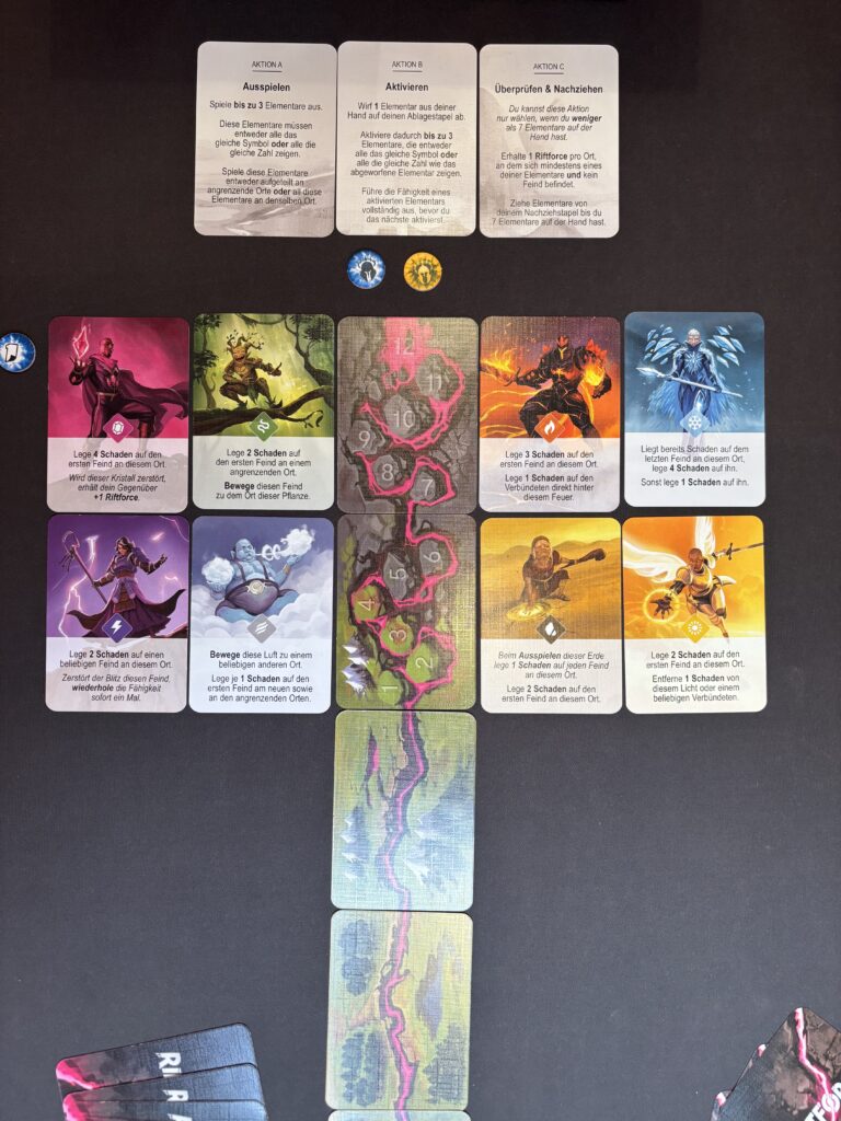 - Überprüfen und Nachziehen: Wenn du weniger als sieben Elementare auf der Hand hast, darfst du überprüfen, ob du einen Ort kontrollierst. Einen Ort kontrollierst du immer dann, wenn sich dort mindestens eins deiner Elementare befindet, jedoch gegenüberliegend kein Feind. Dafür erhältst du „Riftforce“. Anschließend ziehst du so lange Elementare nach, bis zu wieder sieben Stück auf der Hand hast.