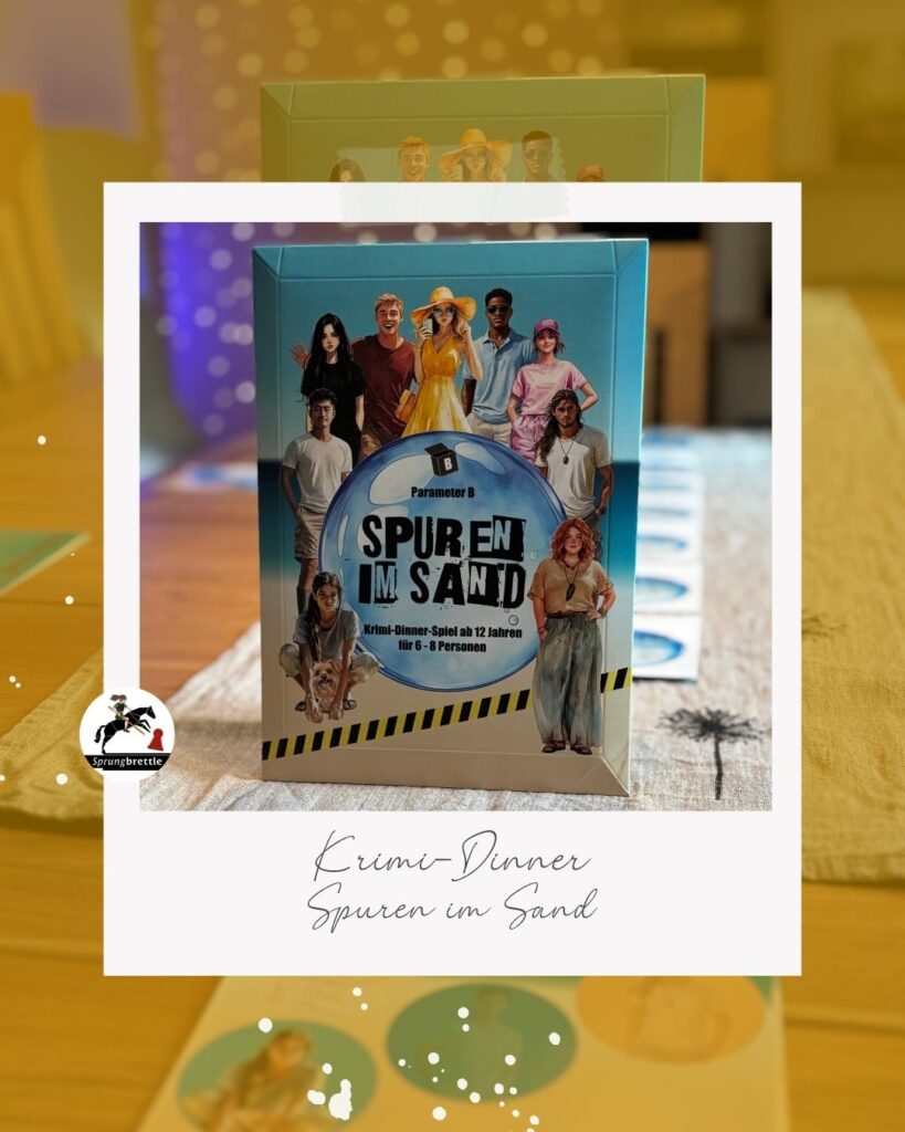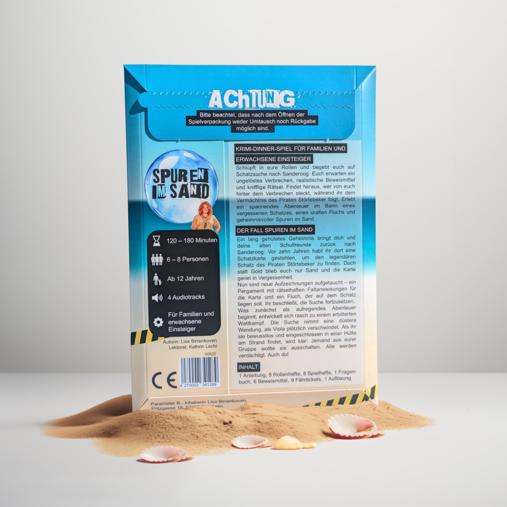 Mit „Spuren im Sand“ legt der deutsche Kleinverlag Parameter B einen weiteren soliden Fall für das Krimi-Dinner daheim vor und erweitert dabei sein Portfolio um eine etwas größere Spielergruppe. Der Verlag, unter der Leitung von Lisa Birrenkoven, hat sich in den letzten Jahren vor allem auf Krimi-Dinner für Einsteiger und Familien spezialisiert. Auf der Website von Parameter B finden sich mehrere Titel, unter anderem „Popstar in Not“ (ab 10 Jahren, 4–6 Personen) und „Im Schatten der Achterbahn“ (ab 12 Jahren, 4–6 Personen). Beide Krimi-Dinner durfte ich schon testen.